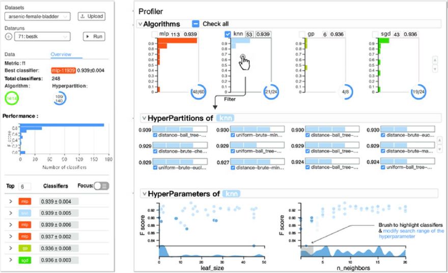 上图是ATMSeer生成的一个用户友好界面,显示有关所选模型性能的深入信息,以及可调整的算法和参数的选项。对没有AutoML经验的机器学习专家的案例研究表明,让用户掌握控制权确实有助于提高AutoML应用的性能和效率。对生物学、金融等不同科学领域的13位研究生的研究也表明,确定用户对AutoML的搜索的自定义关键有三点:搜索的算法数量、系统运行时间以及查找表现最好的模型。研究人员表示,这些信息可用来为用户量身定制系统。