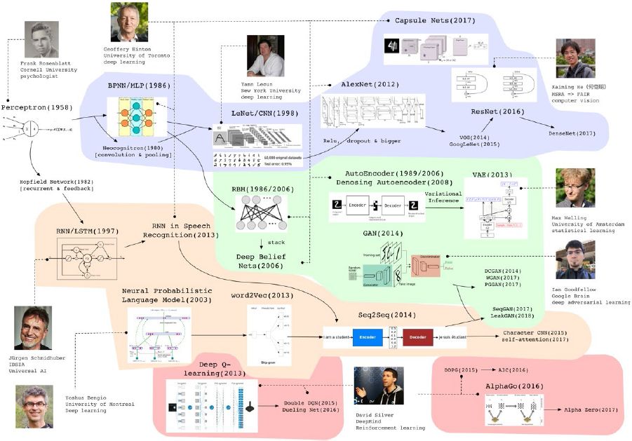 深度学习是近10年机器学习领域发展最快的一个分支,由于其重要性,三位教授(Geoffrey Hinton、Yann Lecun、Yoshua Bengio)因此同获图灵奖。深度学习模型的发展可以追溯到1958年的感知机(Perceptron)。1943年神经网络就已经出现雏形(源自NeuroScience),1958 年研究认知的心理学家Frank发明了感知机,当时掀起一股热潮。