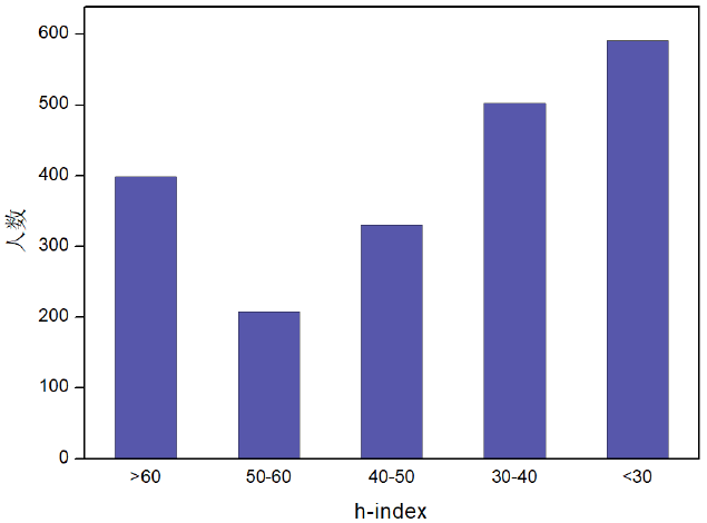 h-index分布 。机器学习学者的h-index分布如下图所示,大部分学者的h-index都在30以上,其中hindex小于30的人数最多,有591人, 占比29.1%。