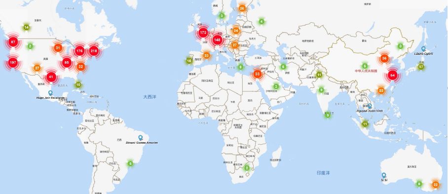 学者地图用于描述特定领域学者的分布情况,对于进行学者调查、分析各地区竞争力现况尤为重要,下图为机器学习领域全球学者分布情况: