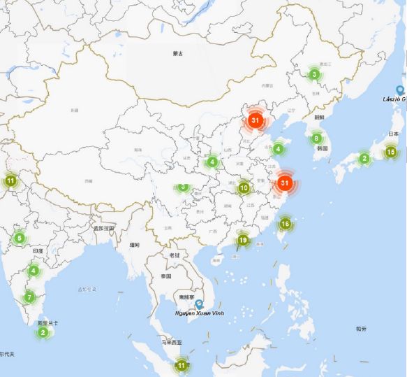 我国专家学者在机器学习领域的分布如上图所示。通过上图我们可以发现,京津地区在本领域的人才数量最多,其次是长三角和珠三角地区,相比之下,内陆地区的人才较为匮乏,这种分布与区位因素和经济水平情况不无关系。同时,通过观察中国周边国家的学者数量情况,特别是与日韩、东南亚等亚洲国家相比,中国在机器学习领域学者数量较多。