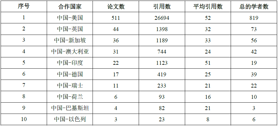 中国与其他国家在机器学习的合作情况可以根据AMiner数据平台分析得到,通过统计论文中作者的单位信息,将作者映射到各个国家中,进而统计中国与各国之间合作论文的数量,并按照合作论文发表数量从高到低进行了排序,如下表所示。