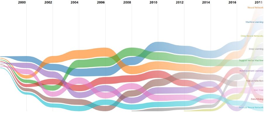 根据技术趋势分析我们可以发现, 该领域当前最热门的话题是Neural Network,从全局热度来看,Neural Network一直保持着较高的线年期间保持着最高的热度并于2018年重登榜首。