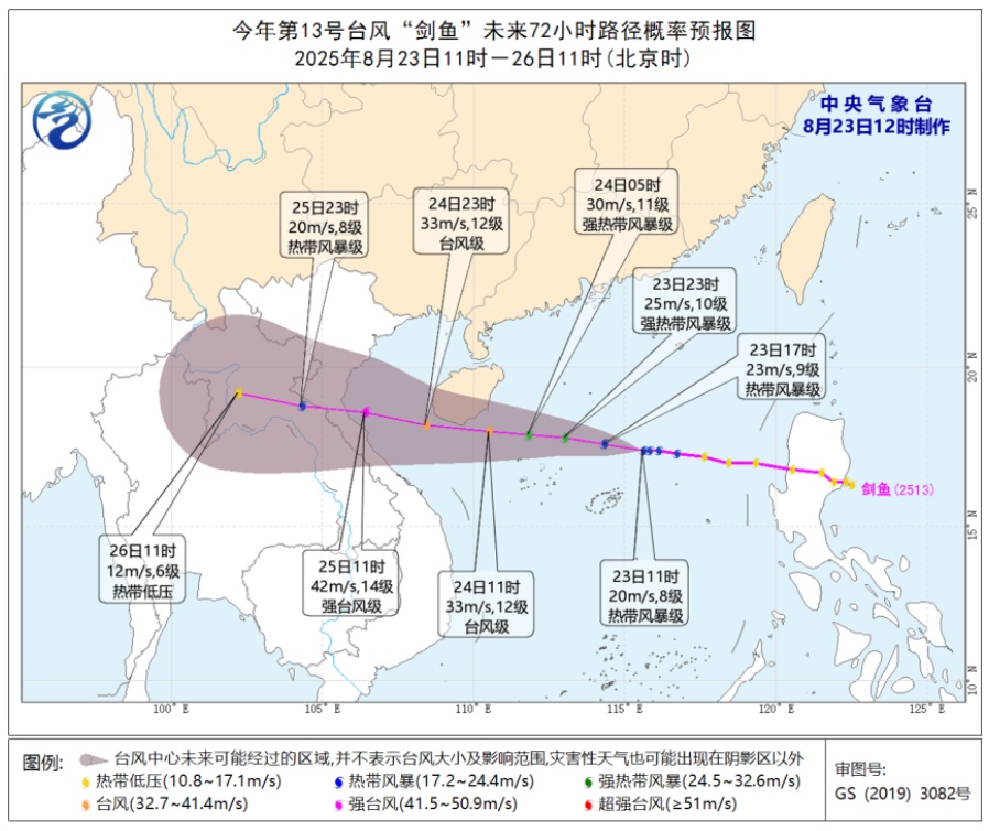 今年第13号台风“剑鱼”(热带风暴级)8月23日11时位于海南三亚市偏东方约650公里的海面上。预计,“剑鱼”将以每小时20~25公里的速度继续偏西方向移动,强度明显加强,最大强度可达台风级到强台风级,24日傍晚前后在海南岛南部沿海擦过或登陆。受其影响,23日至24日,海南岛部分地区、西沙群岛、中沙群岛将有大到暴雨。根据《国家防汛抗旱应急预案》及有关规定,国家防总决定于8月23日12时针对海南启动防汛防台风四级应急响应,并派出工作组赶赴海南协助指导。