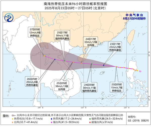 大风预报:8月23日08时至24日08时,南海大部海域、巴士海峡、黄岩岛附近海域、西沙群岛、琼州海峡、广东沿海、海南沿海将有6-8级大风,南海中部偏北和南海北部的部分海域风力有9-10级,台风中心经过的附近海域风力可达11-12级、阵风13-14级。