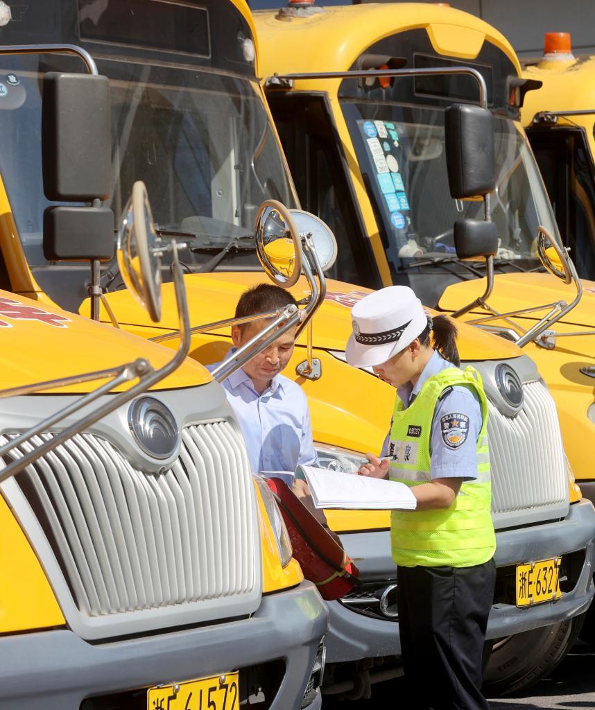 8月22日,在山东省青岛市城阳区上马街道教育服务中心,交管中队民警对校车使用登记情况进行安全检查。新华社发(王海滨摄)