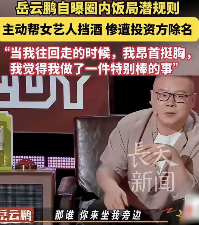 岳云鹏说过有一回参加一个饭局,投资方对某个女艺人有点不怀好意,招呼着她坐自己身边,岳云鹏想帮她解围,就以陪投资方喝酒为由主动坐到了对方旁边,虽然当时投资方没表现不悦,饭局也进行得很顺利,但隔天岳云鹏还是收到了换角通知。不过岳云鹏一点都不后悔自己当时这么做。