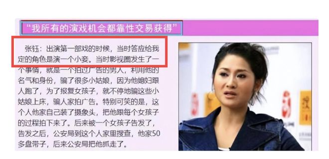 张钰声称她所有的演戏机会都是靠易得来的,她一年陪睡了30多个导演和制片人,有的导演潜规则她后却没有履行承诺给角色,还直接点名导演黄健中曾当着她的面和她的一位朋友“小霞”发生关系。