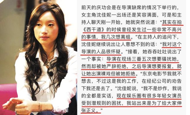 2007年电影《西干道》庆功会上,沈佳妮控诉该片导演李继贤三番五次想要骚扰她,被她严词拒绝之后对她实施报复,要求她出演裸戏,沈佳妮也拒绝了。沈佳妮直言她站出来揭露导演的恶行并非是为了炒作,而是为了伸张正义,她知道圈内很多年轻女演员都饱受潜规则的困扰。