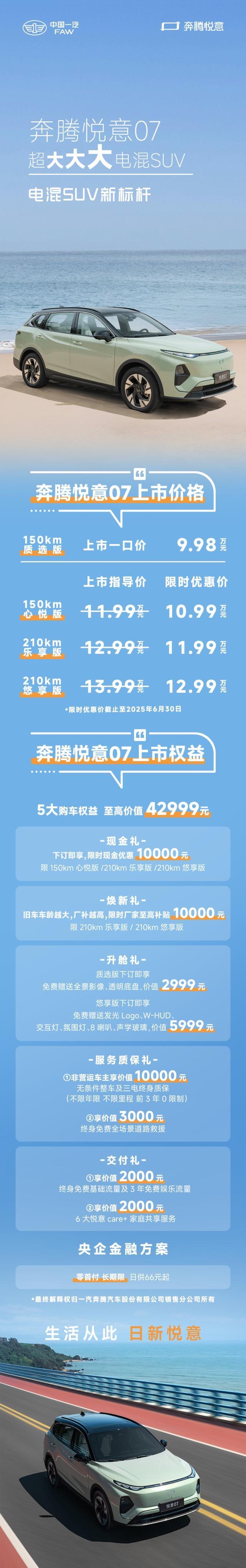作为拥有70年造车底蕴的 国家队,中国一汽以全球化研发矩阵为悦意07注入技术基因,随着悦意07的上市,电混SUV不应是妥协的选择,而是 续航、性能、可靠 全面领先的价值之选,悦意07有望重新书写中国家庭出行新篇。
