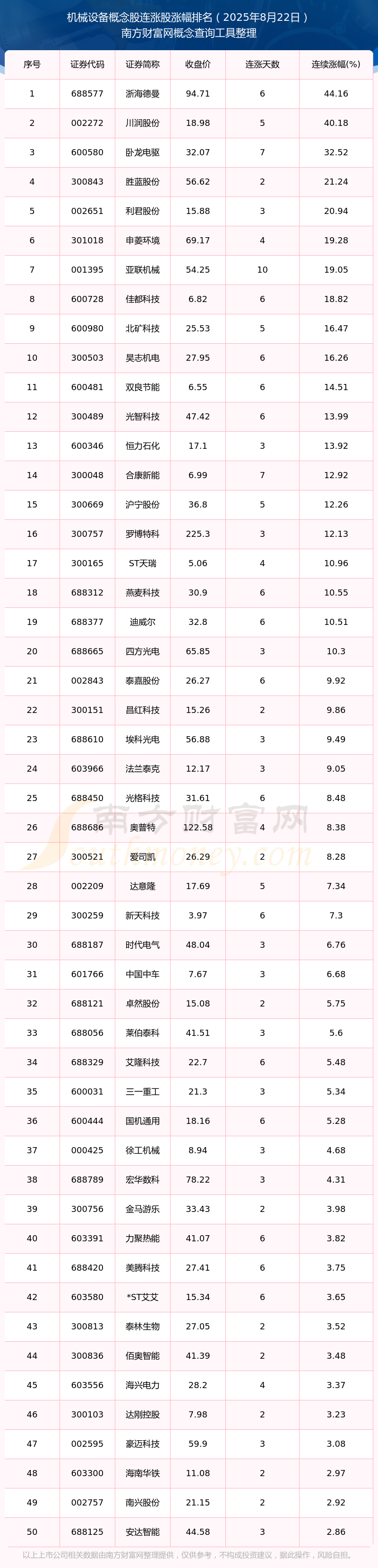 今日机械设备概念股消息:73只个股实现连涨(2025年8月22日)