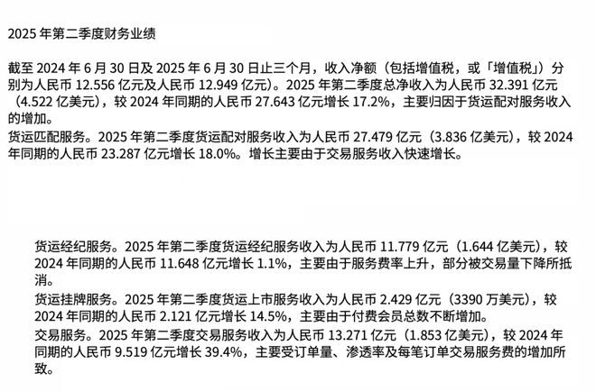 收入方面,二季度货运匹配服务收入同比增长18%,其中,货运经纪服务收入同比增长1.1%,由于服务费上涨,交易量下降部分抵消了这一增长。