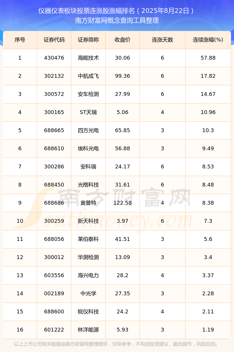 根据南方财富网概念查询工具数据统计,截止2025年8月22日收盘,仪器仪表板块股票共有16只个股实现连涨。其中连续涨幅较大的个股有海能技术、中航成飞、安车检测等,连续涨幅分别为57.88%、17.82%、14.67%。