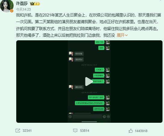 随着质疑声增多,许荔莎再发1400字长文,详细回应与许凯“恋爱”时间线年在欢娱公司的包厢里认识,次日被邀请到许凯家中聚会。