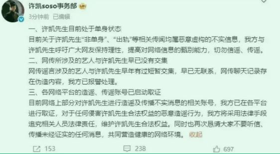 ,所有关于“非单身”、“出轨”的传闻均属恶意虚构的不实信息。工作室还指出网传谣言涉及的艺人与许凯早已没有交集,聊天记录存在伪造内容,已报警处理。