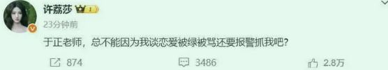 作为许凯和赵晴的老板,知名制片人于正态度强硬地介入此事。他最初在微博评论区回应网友,称有关许凯恋情的消息为“造谣”。