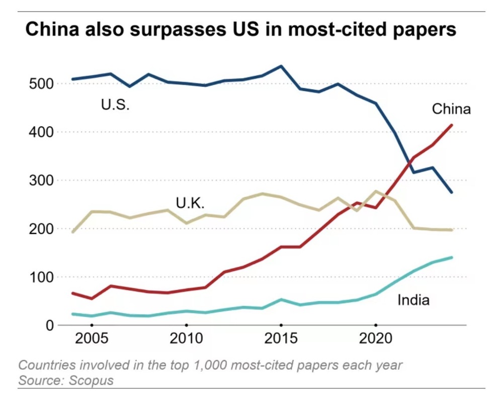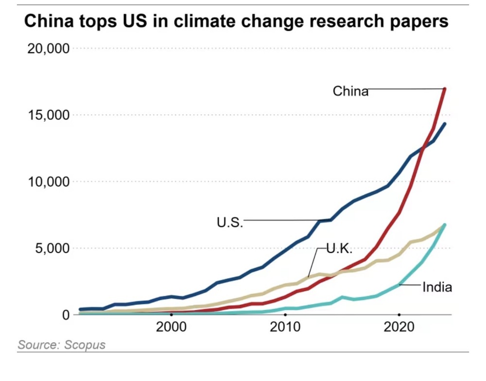 文章说,2023年,中国研究机构发表了约1.4万篇气候变化研究论文,而美国机构的论文数量为1.3万篇。2024年,这一差距进一步扩大。当年全球发表的7.7万篇气候相关论文中,中国贡献了约1.7万篇,而美国的论文数量仅为1.4万篇左右。