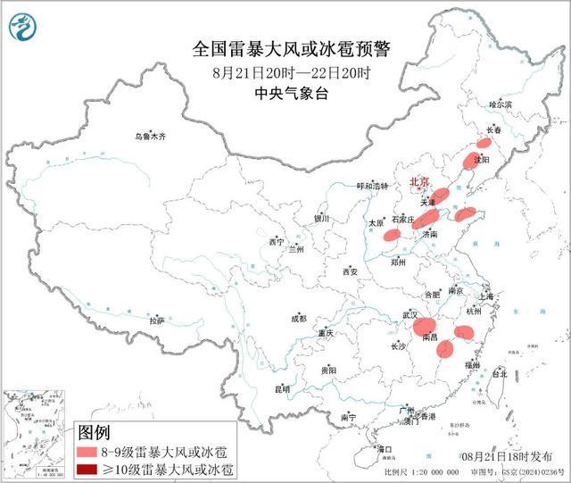 中央气象台8月21日18时继续发布强对流天气蓝色预警