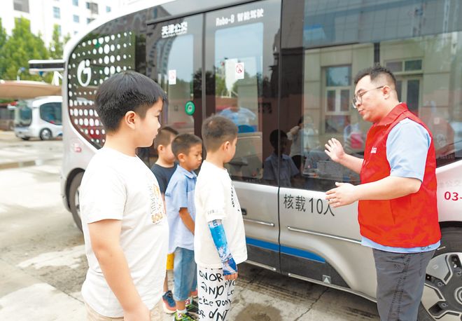 【社区孩子登上智能驾驶公交车】昨天,天津工业大学新校区公交场站变身科技探索实践基地,社区孩子们在这里亲身体验智能驾驶公交车,为暑期生活增添了一抹别样的“科技亮色”。