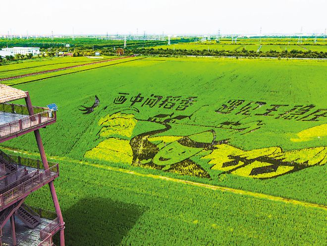 【稻田画初具规模】近日,西青区王稳庄镇丰收塔地块稻田画已初具规模,稻田画融入“稳稳哒小米粒”、粮仓等元素,勾勒出一幅田园景观。