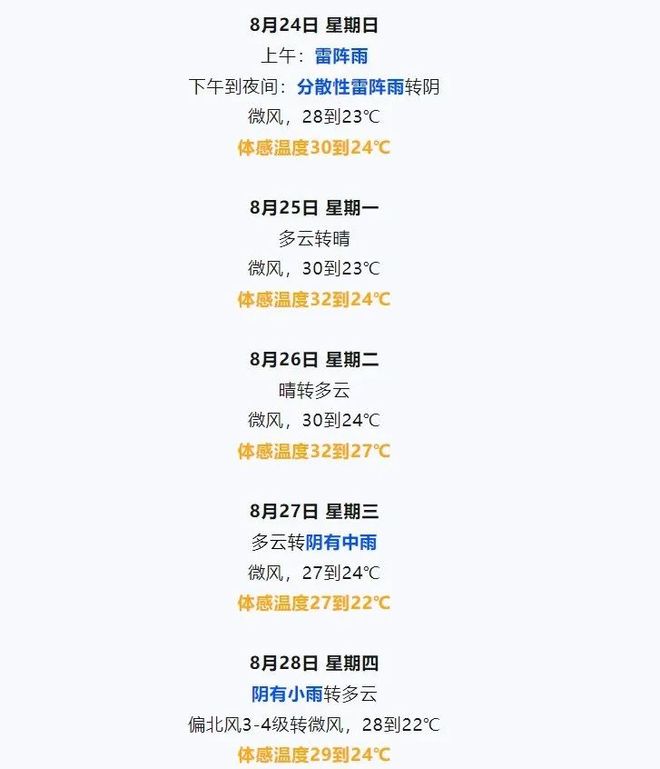 今天白天雷阵雨转阴,东北风1—2级,降水概率40%,夜间雷阵雨,东南风1—2级,降水概率40%,最高温度28℃,最低温度23℃。