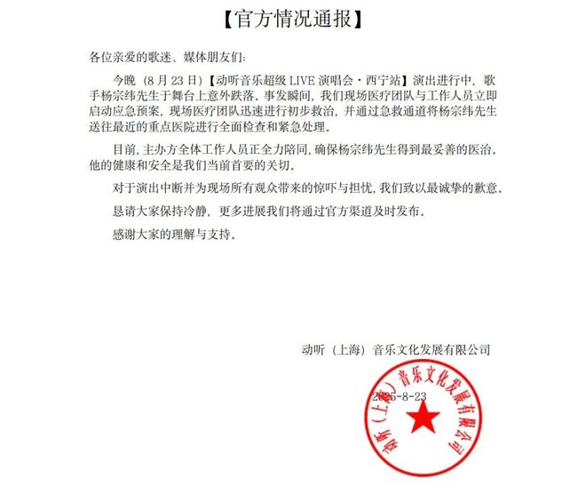 【官方通报杨宗纬摔下舞台】昨晚,歌手杨宗纬在演唱会舞台意外跌落。主办方通报:已送往最近的重点医院进行全面检查和紧急处理,将保证其得到最妥善医治。23日晚,工作人员表示,杨宗纬伤势并无大碍,扭伤了腰,目前人在医院。