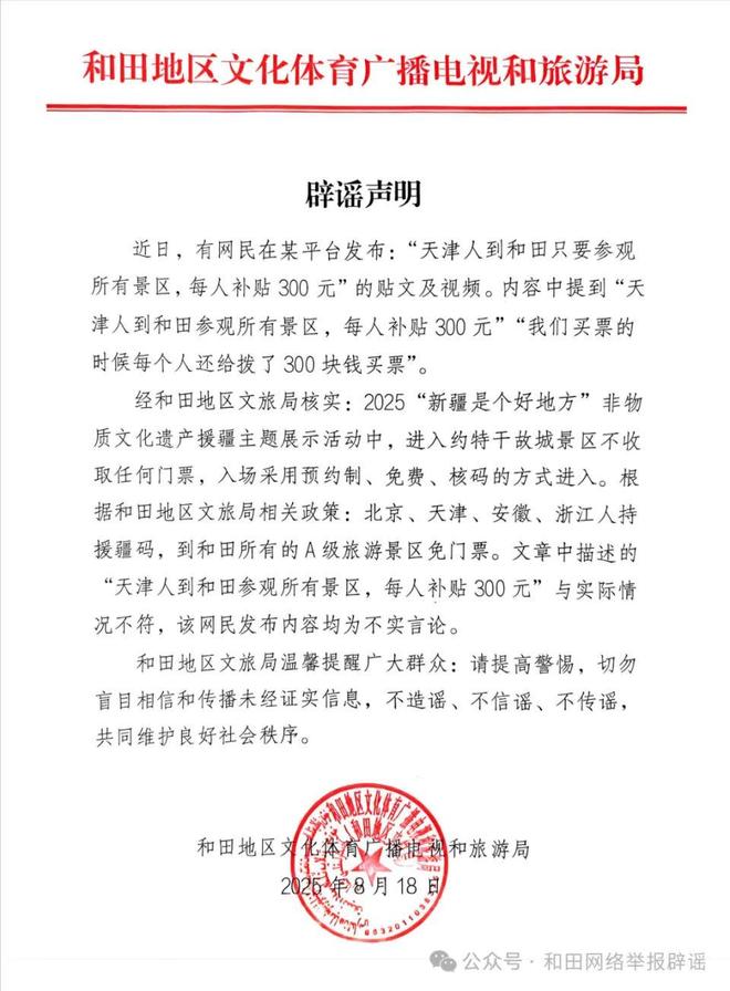 【天津人参观和田景区有300元补贴?假的】近日,有网民在网络平台发文称:“天津人到和田只要参观所有景区,每人补贴300元”。经新疆和田地区文旅局核实,该信息内容不实。