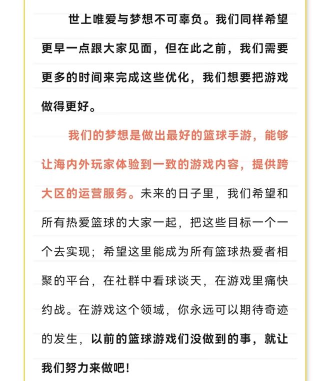 项目组:首先,我们的目标从不是赚一波快钱就走,而是真的想做一款长线的“全球最好的篮球手游”,这个目标很早就写在了我们的内部群公告上面。