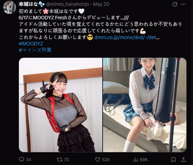 圈内人强调本城花是有条件养成的新人,“脸蛋有偶像的模样,五官非常精緻,没有牙齿太乱的问题,笑起来很好看、唉唉叫的模样也很迷人”,加上有创立X帐号,推测有想在这一行长久发展的打算,虽然目前以企划身分出发,不过以经纪公司的能力而言,看好未来能像前辈“北冈果林”一样,成为众所瞩目的焦点。