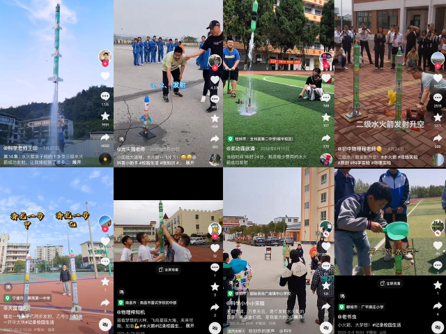 打开抖音搜索“水火箭”,可以看到全国多地中小学的相关实验。《报告》显示,2023年抖音“水火箭”相关视频总数同比增长789%,发布该类视频的老师同比增长62%。