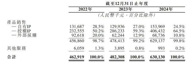 如下图所示,产品销售是52TOYS主要营业收入来源,其中授权IP收入占比自2022年的50.2%一路上涨至2024年的64.5%,而自有IP营收占比则从2022年的28.5%降至24.5%。