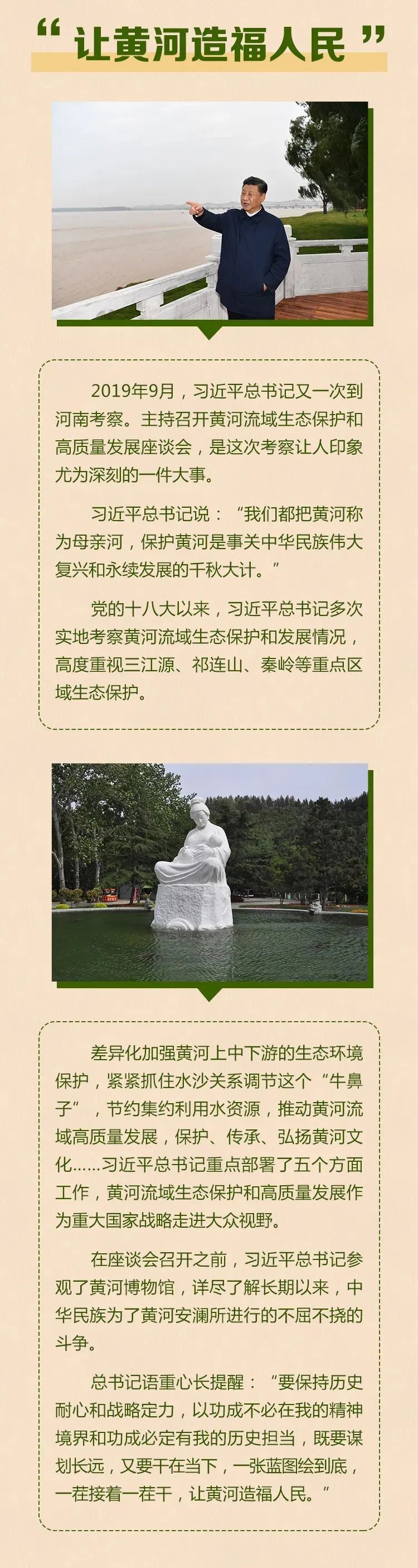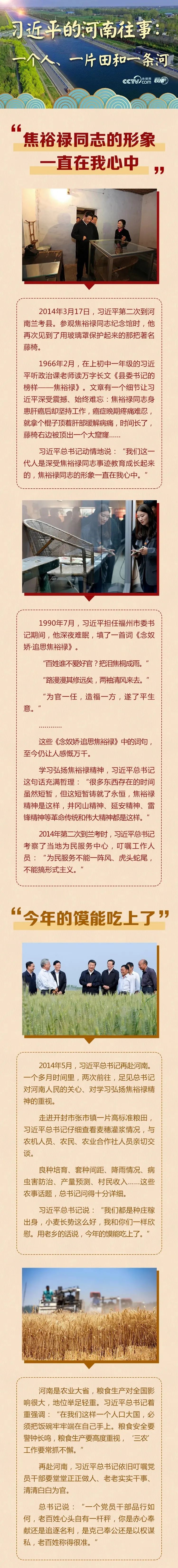 习十分关心河南人民群众,曾多次到河南考察,留下许多让人印象深刻的往事。兰考县的好干部焦裕禄,开封市的高产小麦田,涓涓流淌的母亲河……这里的人、田和河,都如此令人难忘。
