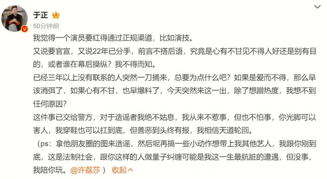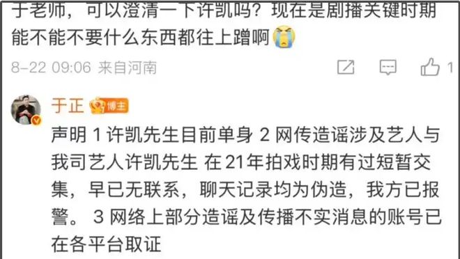 戏剧性的是,这场爆料从一开始就呈现出强烈的对抗性。于正几乎在第一时间下场灭火,不仅宣称许凯目前单身,更将许荔莎的指控定性为 “伪造聊天记录的蹭热度行为”。