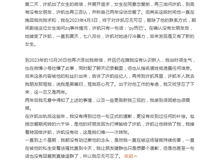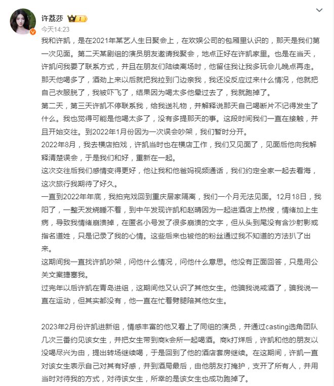 更具杀伤力的是许荔莎的时间线 字长文中详细描述了与许凯从 2021 年相识到 2022 年分手的全过程,包括被醉酒猥亵的细节、多次分分合合的纠葛,以及许凯用 “同款套路哄骗女生回住所” 的指控。