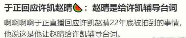 面对舆论压力,于正团队的回应策略却显得破绽百出。一方面,他否认许凯与赵晴的恋爱关系,声称 “赵晴只是在辅导许凯台词”(还好不是在学英语);另一方面,却被网友翻出 2022 年其本人承认两人恋爱的言论 ——“一线男演员也是人,要允许他们偶尔下凡”。