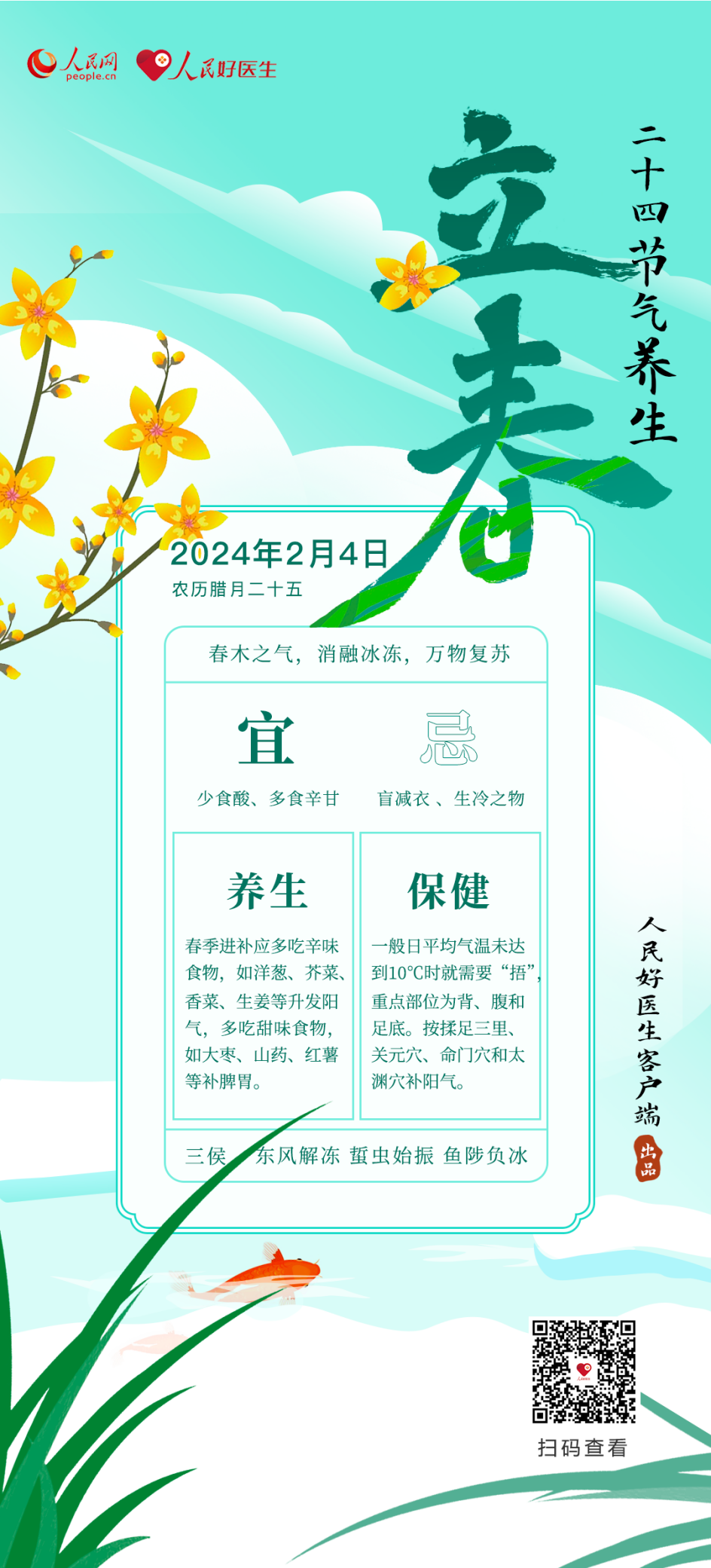 一年之计在于春,一日之计在于晨。春阳升动,万物复苏。2月4日,我们迎来二十四节气中的第一个节气立春。立春意味着大地回暖,万物生长,冬将尽,春正来。立春时节是保健养生的重要时期,此时虽阳气渐升,气温慢慢回暖,但寒气仍较重,常见气温骤降的“倒春寒”,养生应以顾护阳气为首要原则。那么,立春时节该如何养护阳气?该如何顺应时节养生?人民好医生