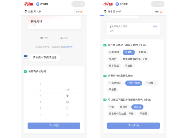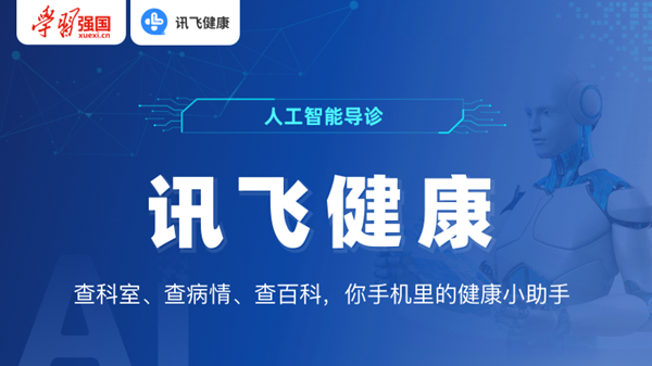 “讯飞健康”是由科大讯飞联合“学习强国”学习平台共同推出,利用语音交互、自然语言理解、医学认知智能与推理技术等,实现智能导诊、疾病自查等功能的智能服务助理。用户进入智能导诊页面后,可以将病症情况以文字或语音的形式描述出来。系统基于医疗问诊数据,询问用户分诊症状的详细诱因、症状性质等信息,生成结构化病历。