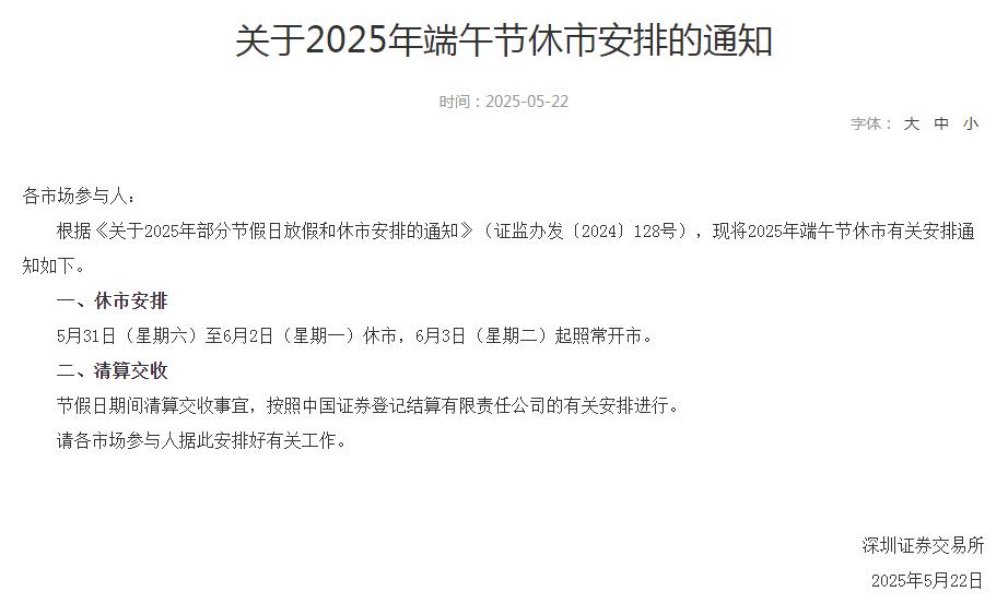 根据《关于2025年部分节假日放假和休市安排的通知》(证监办发〔2024〕128号),现将2025年端午节休市有关安排通知如下。