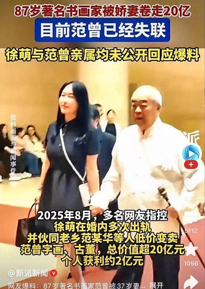 这个比他小50岁的老婆不仅多次出轨更是卷走接近20亿的字画古董!据媒体报道,有网友曝料,87岁著名书画大师范曾的37岁妻子徐萌近日分多次搬空其宅中收藏字画、古董价值超20亿。