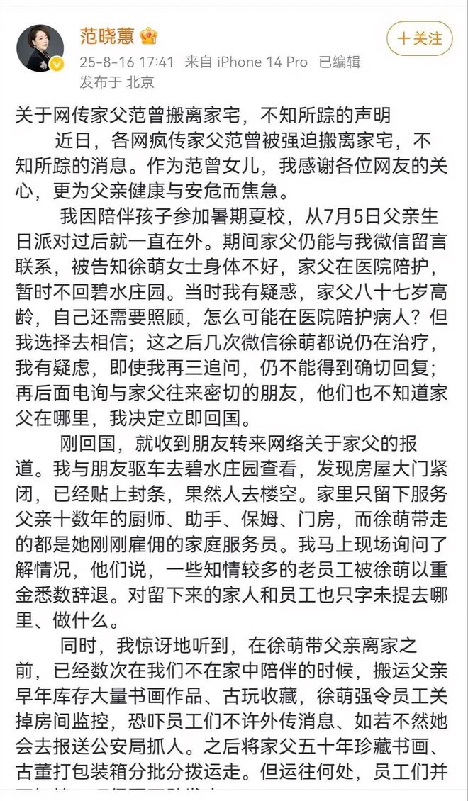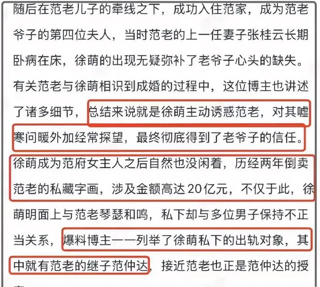 再结合之前的知情人爆料,范仲达曾故意安排徐萌接触范曾,上位成功后徐萌不仅出轨继子,还和其他的情夫倒卖范曾私藏字画,涉及金额高达20亿。