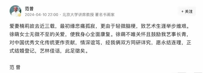而就在一年前的2024年4月10日,范曾在社交平台发文宣布再婚。如今来看,或许就是黄粱一梦。“爱妻楠莉故去近三载,最初缘悲痛孤寂,更由于轻微脑梗,致艺术生涯举步维艰。