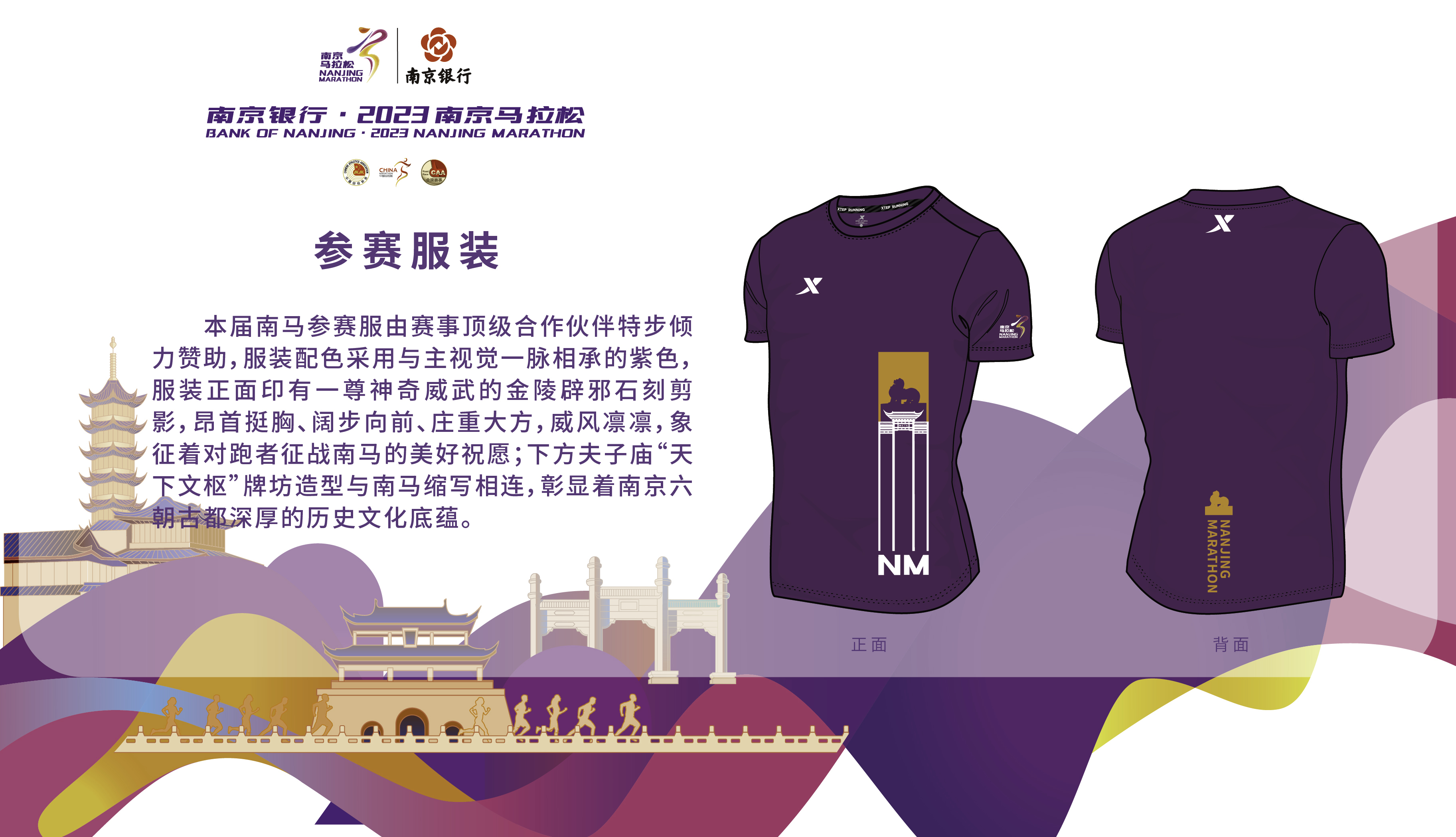 本届南马参赛服由赛事顶级合作伙伴特步倾力赞助,服装配色采用与主视觉一脉相承的紫色,服装正面印有一尊神奇威武的金陵辟邪石刻剪影,昂首挺胸、阔步向前、庄重大方,威风凛凛,象征着对跑者征战南马的美好祝愿;下方夫子庙“天下文枢”牌坊造型与南马缩写相连,彰显着南京六朝古都深厚的历史文化底蕴。