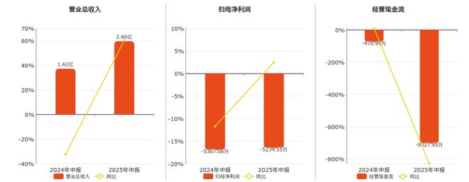 公司营业总收入为2.60亿元,较去年同报告期营业总收入增加129.10万元,实现2年连续上涨,同比较去年同期上涨0.50%。归母净利润为-5234.55万元,较去年同报告期归母净利润增加90.35万元。经营活动现金净流入为-9027.95万元。