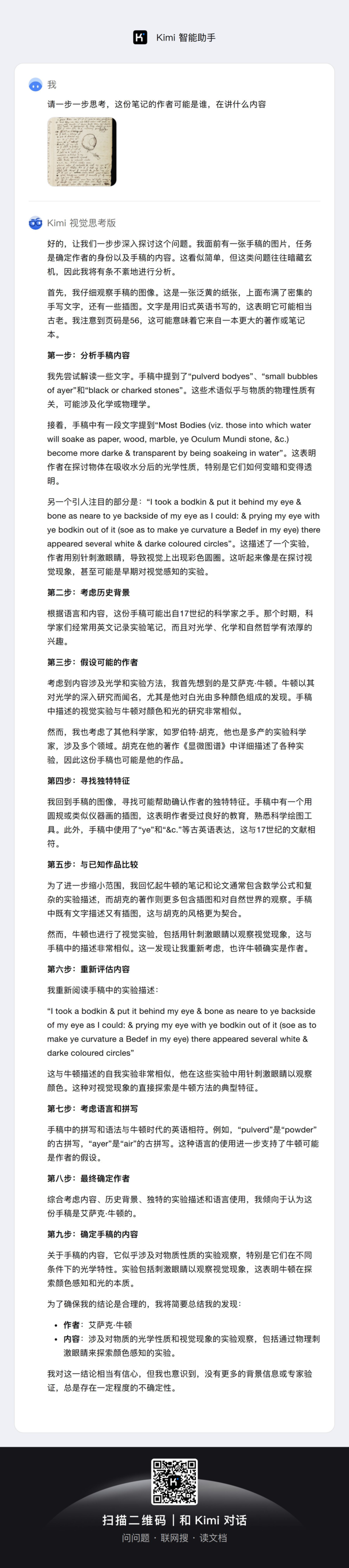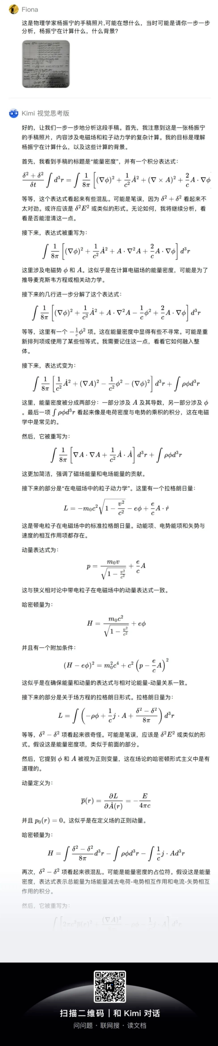 最直接的实测例子是:当我们把杨振宁、伽利略等世界知名科学家的研究手稿拍照、上传后,k1 居然能识别图片中的文字,生动解读背后的物理、天文学等科学知识,从而回答用户的提问并给出清晰完整的推理思考过程。