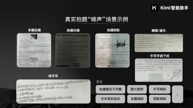 基准测试数据显示,在复杂拍摄条件下,例如照片图像不清晰、多题一起拍、手写字迹干扰,甚至纯手写的题目等场景,k1 模型相比 OpenAI 和 Anthropic 的视觉思考模型,有更显著的领先优势: