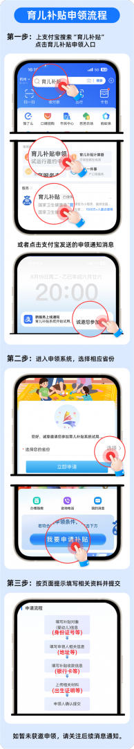 此前来支付宝订阅了申领通知、但暂时还没收到消息的宝妈宝爸,别着急,请耐心等待通知,这两天多留意你的支付宝。此前从未订阅申领通知的用户,仍可上支付宝,搜“育儿补贴”,订阅申领通知,等待邀约。