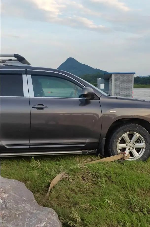 暴雨涨水柳州一辆SUV被困“孤岛”车轮与石头绑在一起防冲走