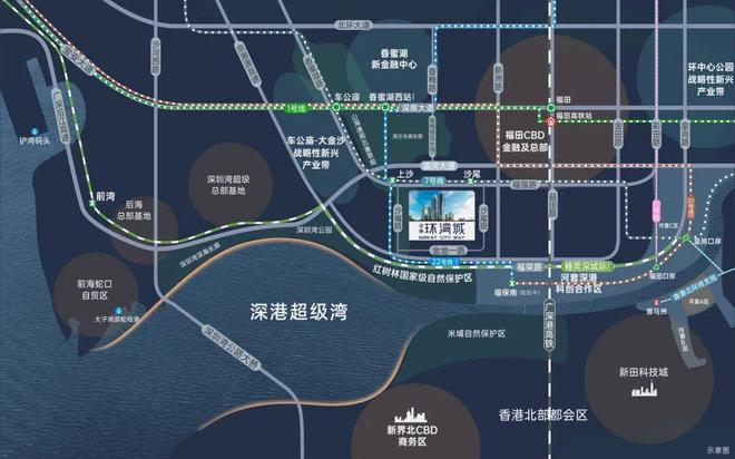 双地铁线号线号线双地铁上沙交汇站(规划中),1站直达香蜜湖新金融中心与河套深港创新合作区。·超级口岸:皇岗口岸深度改造,深港唯一24小时陆路通关口岸,3城轨+2地铁,迅捷连通深港河套两地。·联港通沪:沪深高速磁悬浮规划,约2.5h通达沪深,链接“上广深港”南中国超级都会群。·城际轨道:全面覆盖广深科技创新走廊的穗莞深城际铁路,贯通大湾区重要科技核芯;深广中轴城际铁路,直连广深城市中心;香港北环支线,再添深港连通新轨道,便利畅达尖沙咀。