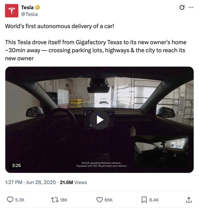 北京时间 6 月 28 日消息,特斯拉 CEO 马斯克在 X 平台宣布:「首辆特斯拉 Model Y 已实现全自动从工厂开到客户家的交付任务,包括高速路段,而且比原计划提前一天完成!」