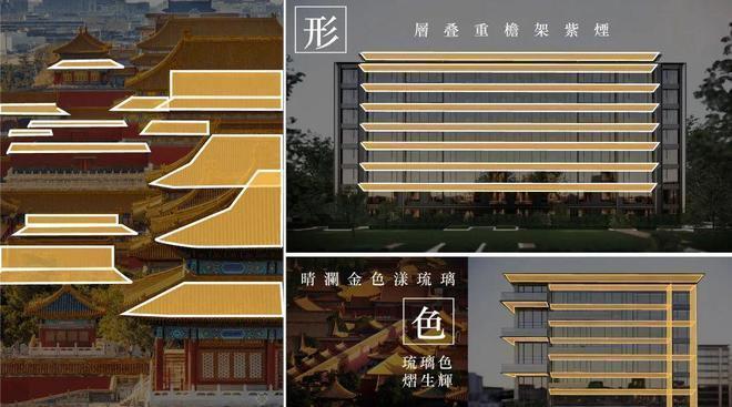 撷取北京城市色彩,以深浅灰色铝板为底,皇家传统浅金色金属飞檐勾勒出舒展轮廓,再现“晴瀾金色漾琉璃”的奢华印象。